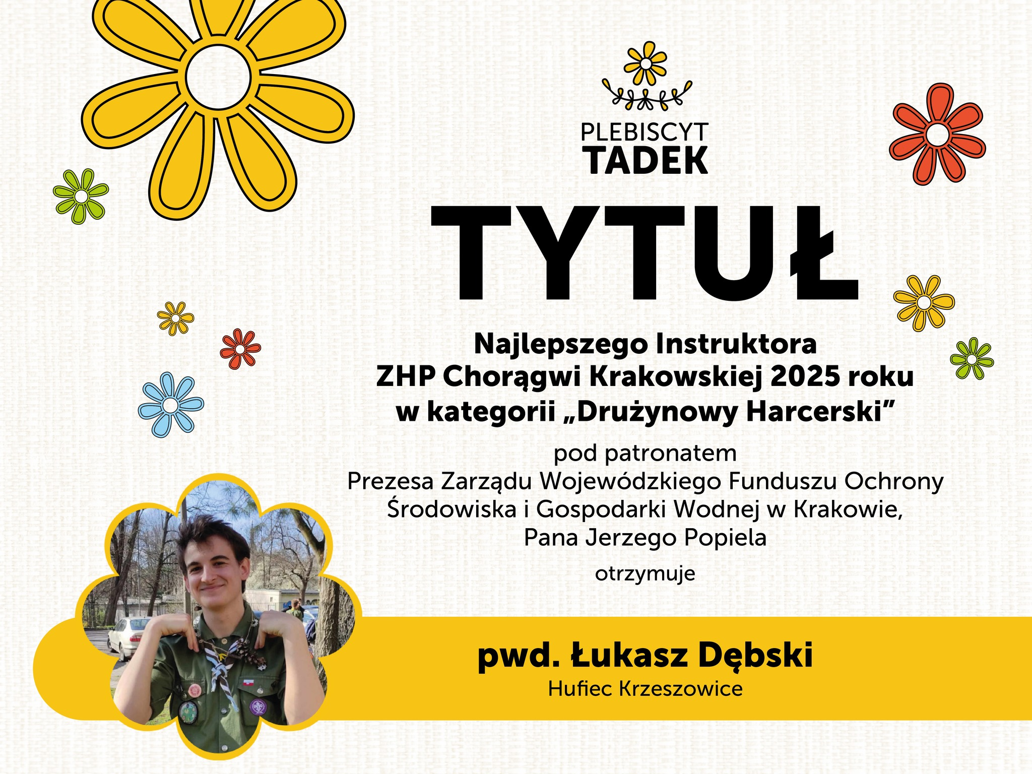 Tytuł Najlepszego Instruktora ZHP Chorągwi Krakowskiej 2025 roku w kategorii „Drużynowy Harcerski”, pod patronatem Prezesa Zarządu Wojewódzki Fundusz Ochrony Środowiska i Gospodarki Wodnej w Krakowie, Pana Jerzego Popiela, otrzymał przewodnik Łukasz Dębski z Hufiec ZHP Krzeszowice. Harcerstwo promuje praktyczną edukację ekologiczną, która uczy, jak żyć w zgodzie z naturą i dbać o środowisko. Patronat Funduszu w tej inicjatywie jest wyrazem docenienia tych działań oraz wspólnej troski o otaczającą nas przyrodę.